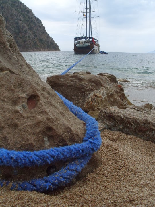 Llevo aqui 18 días y bien que podían haber sido 388 porque solo puedo hablar maravillas de este lugar. Esta cerca de Fethiye y de Ouledinez, y solo se puede acceder al Valle en bote; o bajando 40 minutos de despeñaderos con ayuda de Dios y unas cuerdas por una abrupta montaña vertical. Eso fue lo que hice el otro día, cargado de naranjas y bolsas de la compra porque, no sé quien fue el gracioso que me dijo que hasta los niños lo hacían, y atardeciendo las pasé más que canutas. Una cabra vino a mi rescate cuando ya lo tenía jodido y ella me guió por las rocas oscuras y escarpadas. Al día siguiente tuvieron que rescatar a dos extraviados, por cierto. También se puede llegar aterrizando en parapente, que es la opción mas inusual pero que los dos jovencitos galeses, Andy y James, divertidos que te tronchas, hicieron para mi asombro playero la otra tarde.